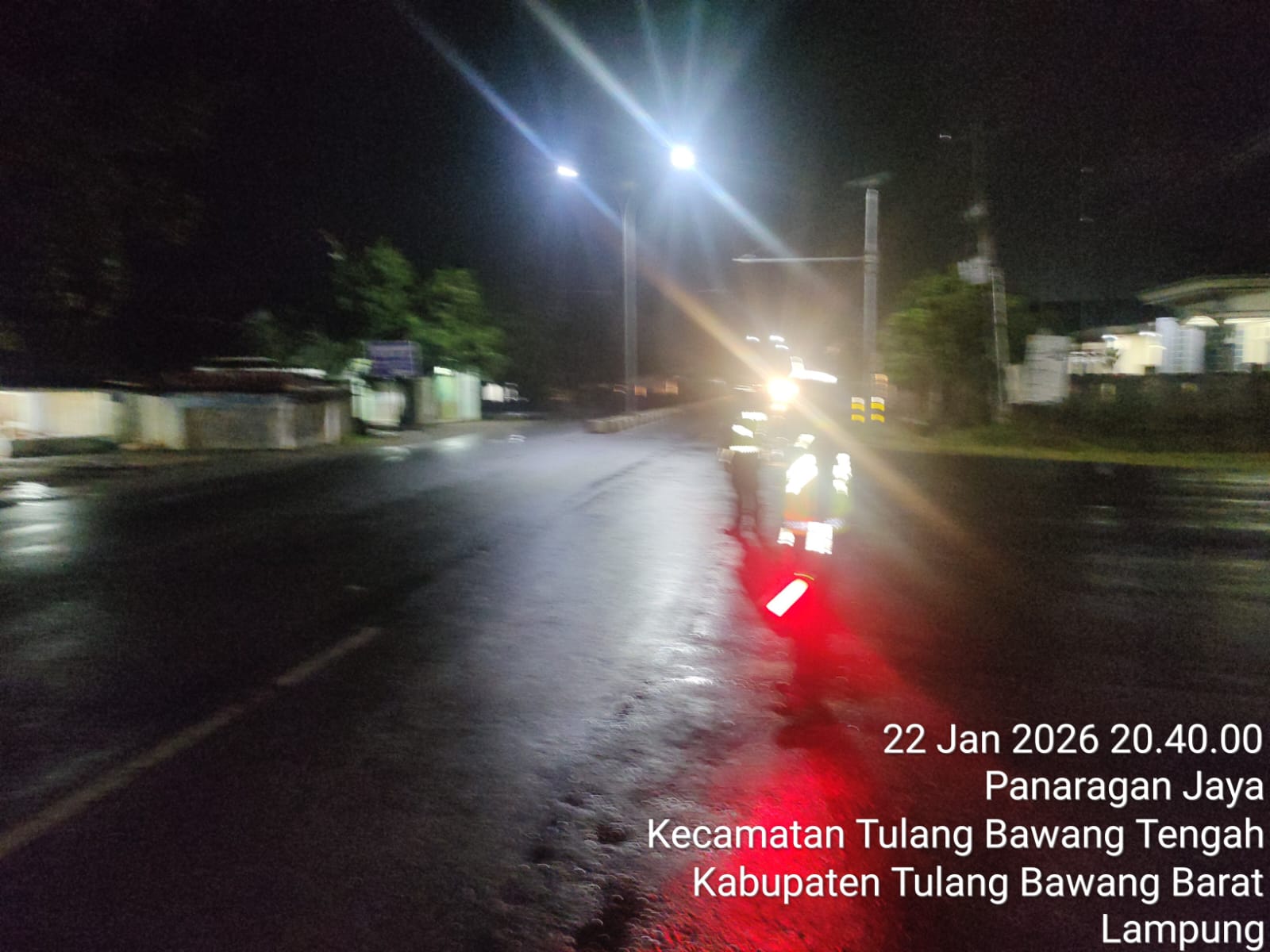Tulang Bawang Barat – Guna menciptakan keamanan dan rasa nyaman di tengah masyarakat, khususnya pengguna jalan yang melintas di malam hari, Sat lantas Polres Tulang Bawang Barat, Polda Lampung melaksanakan pam rawan malam patroli blue light di Jalan Raya Simpang Uluan Nughik Kec.Tulang Bawang Tengah Kab. Tulang Bawang Barat, Kamis (22/01/2026) malam